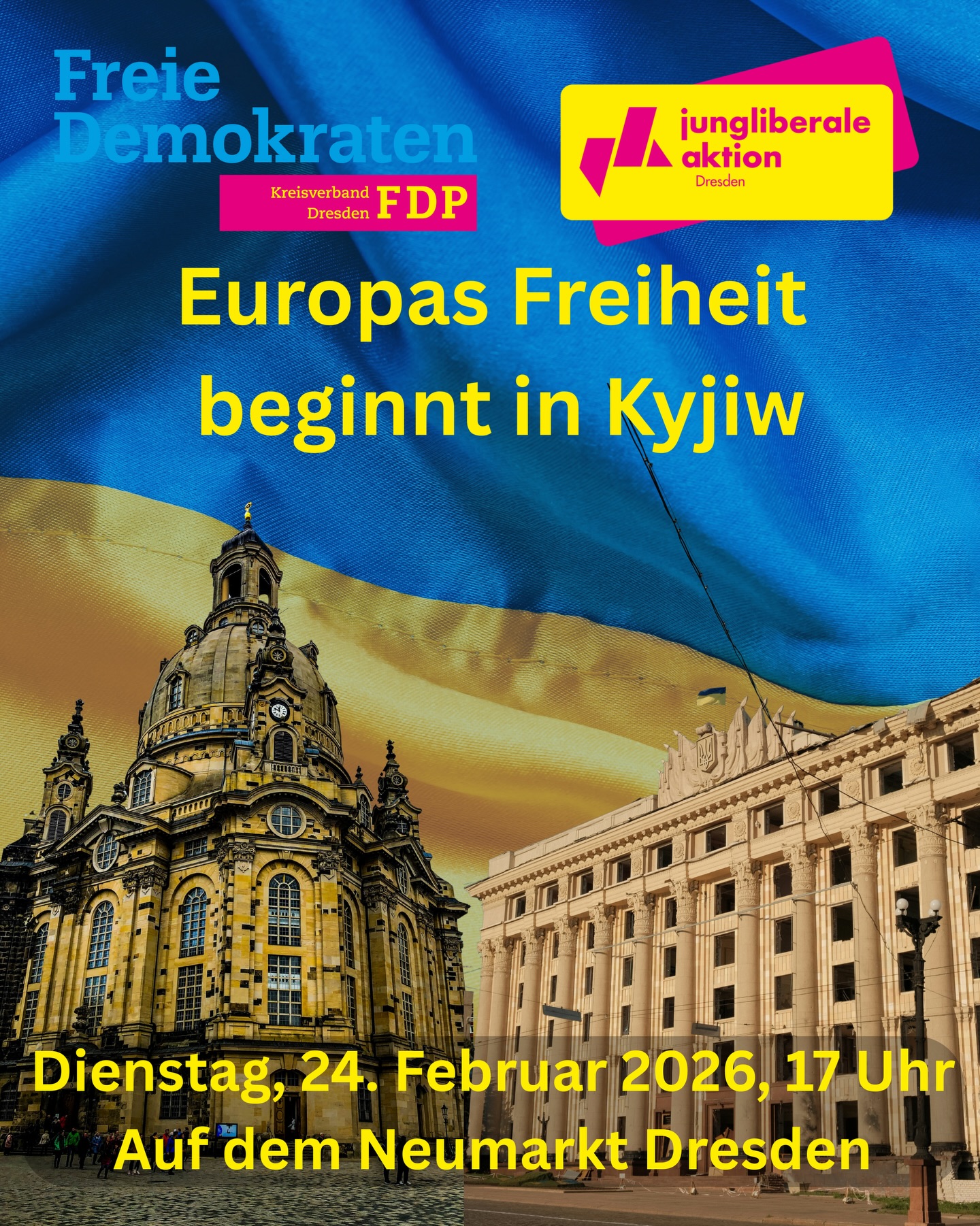 Europas Freiheit beginnt in Kyjiw. 🇺🇦🇪🇺 Gemeinsam stehen wir an der Seite der Ukraine – für Frieden, Selbstbestimmung und ein starkes Europa. 📍 24. Februar 2026 | 17 Uhr 📍 Neumarkt Dresden #EuropasFreiheit #Kyjiw #Ukraine #StandWithUkraine #Frieden